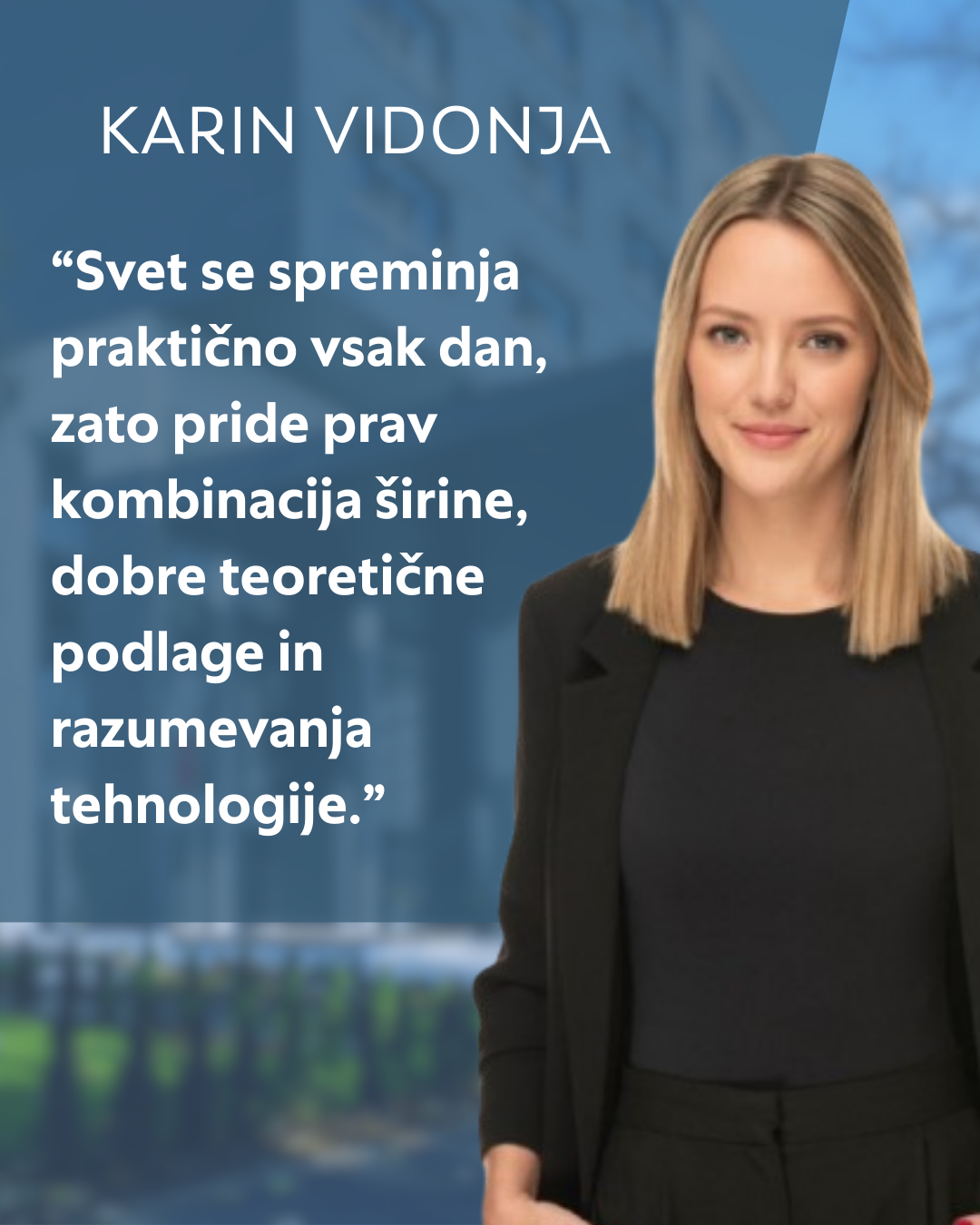 FDV mi je dal široko znanje in način razmišljanja, ki ga še danes uporabljam pri svojem delu. Naučil me je povezovati teorijo, tehnologijo in strategijo v smiselno celoto ter razmišljati celostno in kritično o projektih. Poleg tega sem na FDV-ju pridobila veliko praktičnih izkušenj in spoznala ljudi z zelo različnih področij, kar mi je kasneje pomembno pomagalo pri karieri. Cenim tudi to, da se profesorji resnično potrudijo – niso le predavatelji, temveč znajo študente usmerjati, se prilagajati generacijam in iz vsakega predmeta narediti nekaj uporabnega.